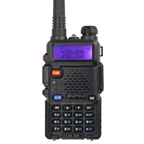 The BAOFENG UV5R is a compact handheld radio scanner transceiver providing 5 watts in the frequency range of 136-174/400-480MHz. It is a compact, economical HT that includes a special VHF receive band from 65-108 MHz which includes the regular FM broadcast band. Dual watch and dual reception are supported.
